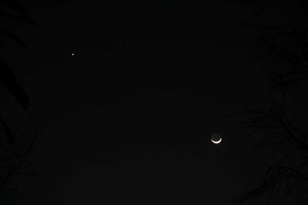Venus and the Moon – Jan 25 2012 Published January 25, 2012 at 1000 × 667 in The Moon says “Hi” to Venus tonight. The Moon is just 2.6 days old so a very slim crescent is visible – but Earthshine is clearly visible on the unlit portion.